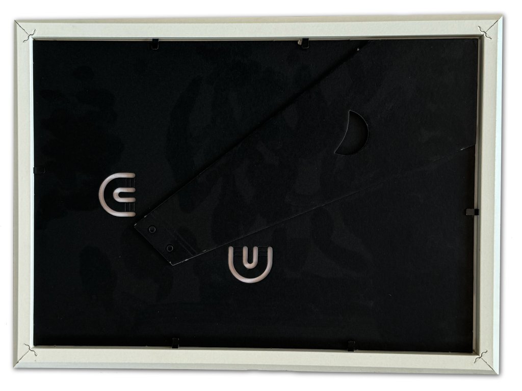 Rámeček bílé barvy můžete díky skládácí nožce postavit na stůl. Anebo jej pověsit na zeď.