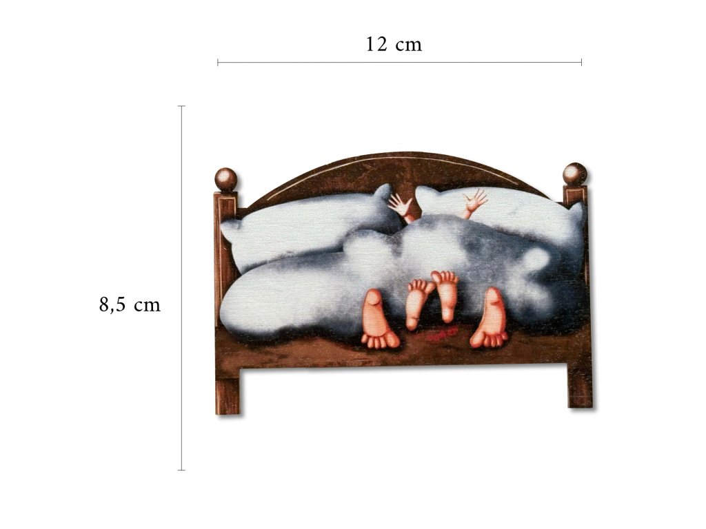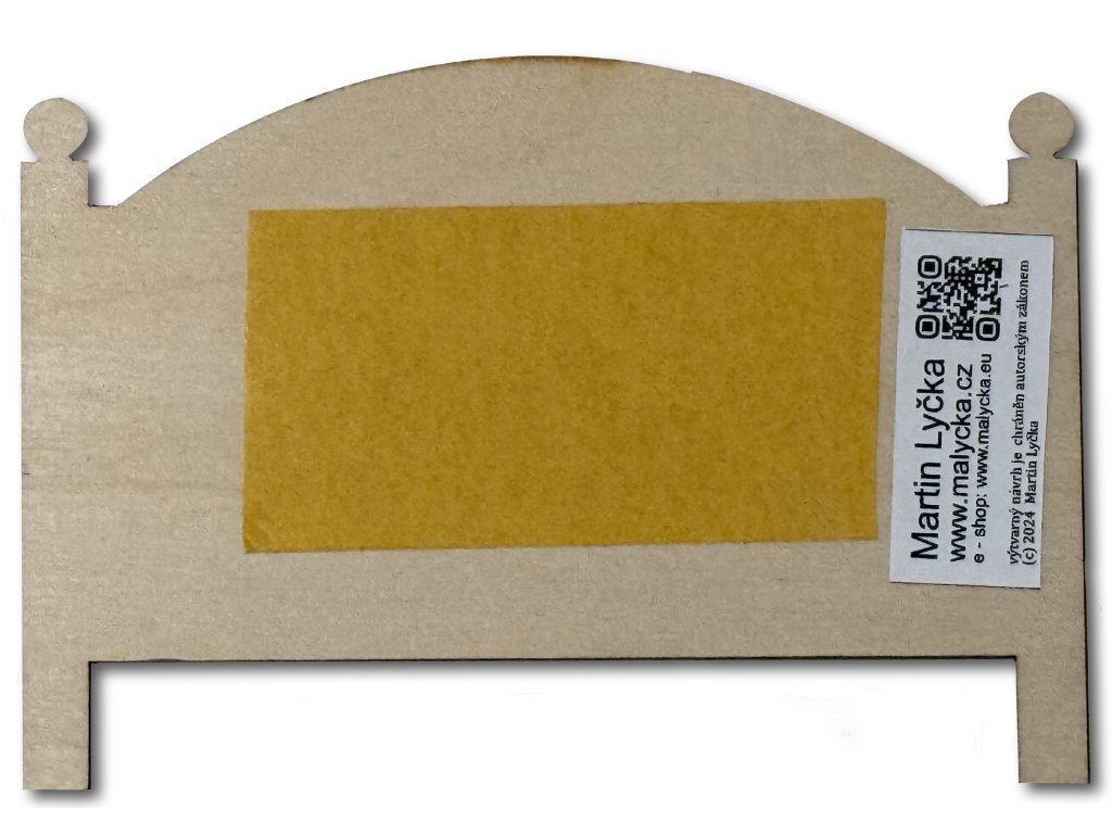 Rozměry 110 mm x 98 mm x 3 mm. Tištěno technologii UV tisku na dřevěnou desku. Přesněji překližku.