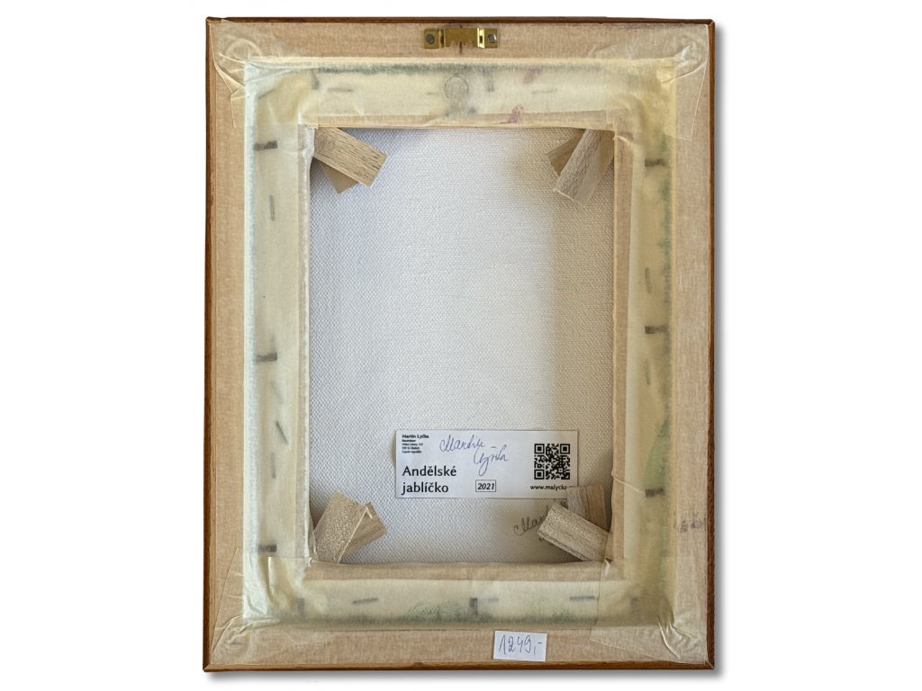 Obraz je podepsán autorem. Na zadní straně konzole pro pověšení na zeď.