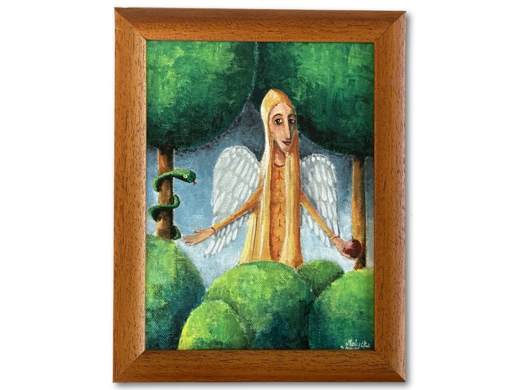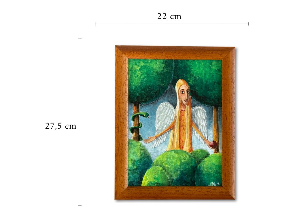 Malováno akrylovou barvou na plátno a zarámováno v rámečku přírodní barvy dřeva.