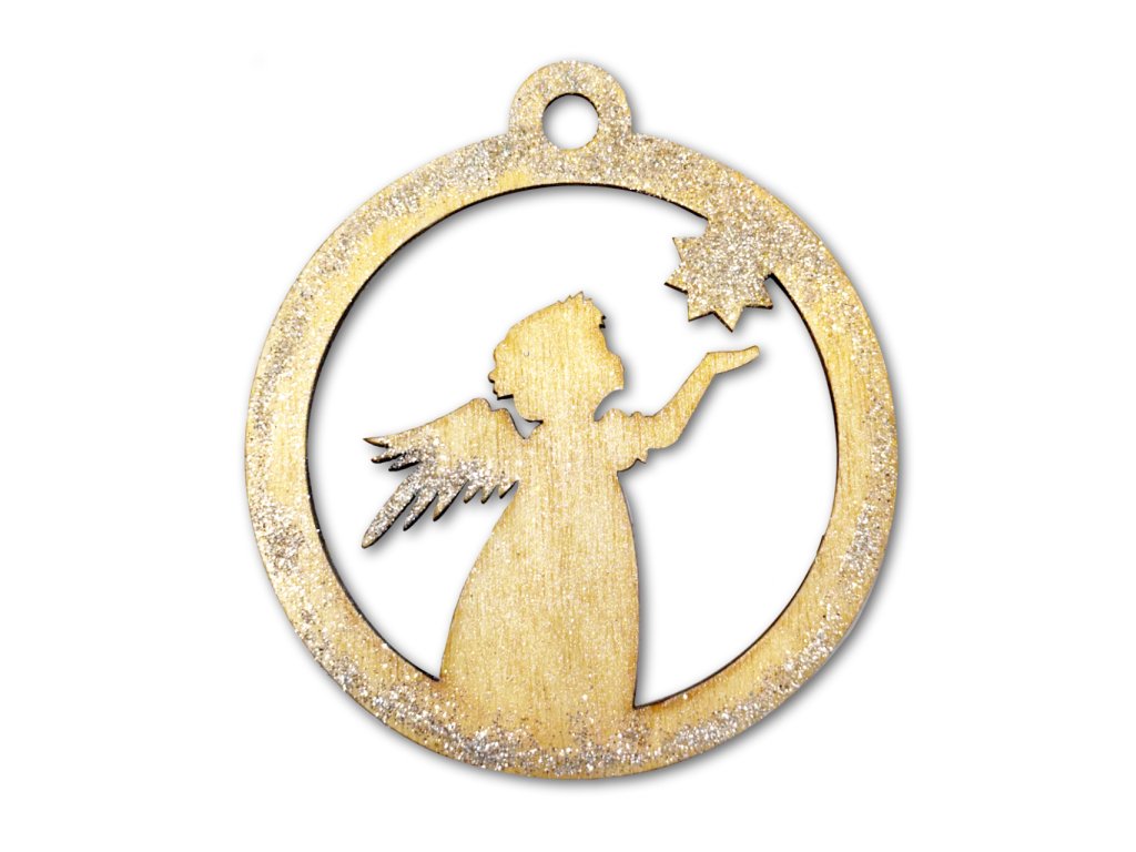 Dřevěná ozdoba na vánoční stromeček s motivem andílka zdobená perleťovou barvou a třpytkami.