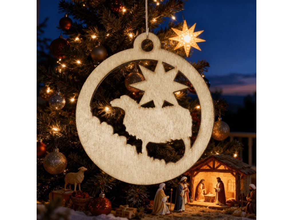 Dřevěná ozdoba na vánoční stromeček s motivem beránka