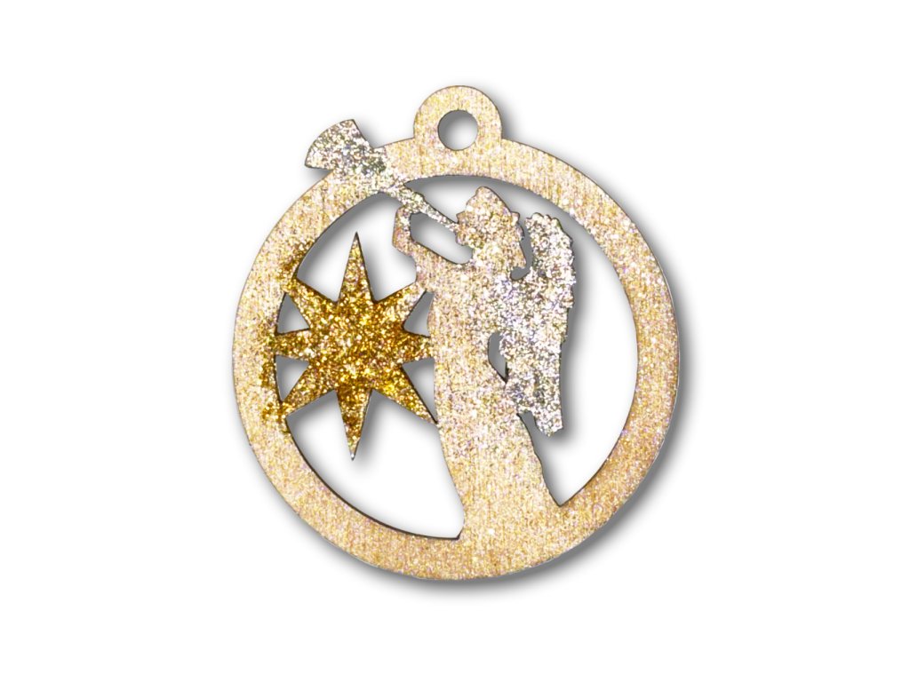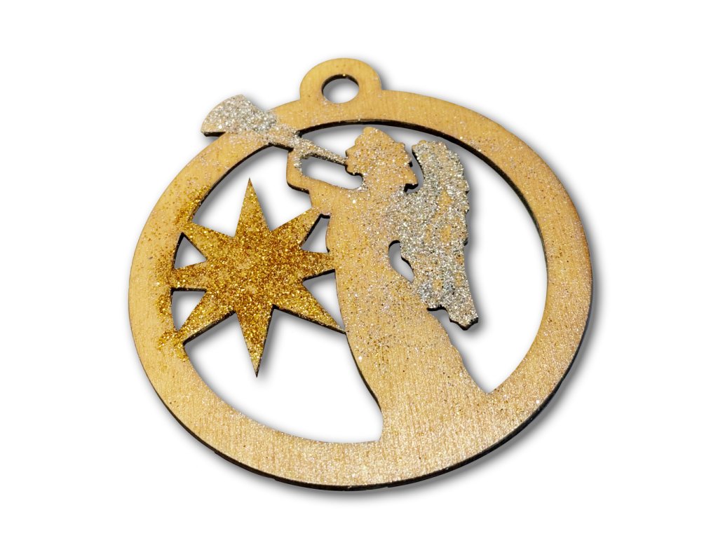 Dřevěná ozdoba na vánoční stromeček s motivem Anděla s trubkou zdobená perleťovou barvou a třpytkami.