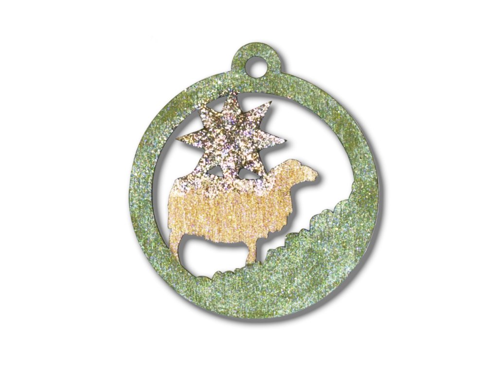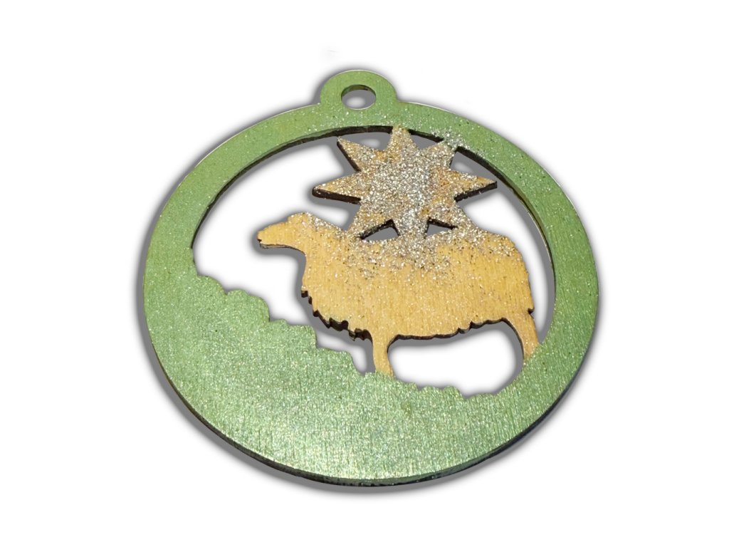 Dřevěná ozdoba na vánoční stromeček s motivem beránka zdobená perleťovou barvou a třpytkami.