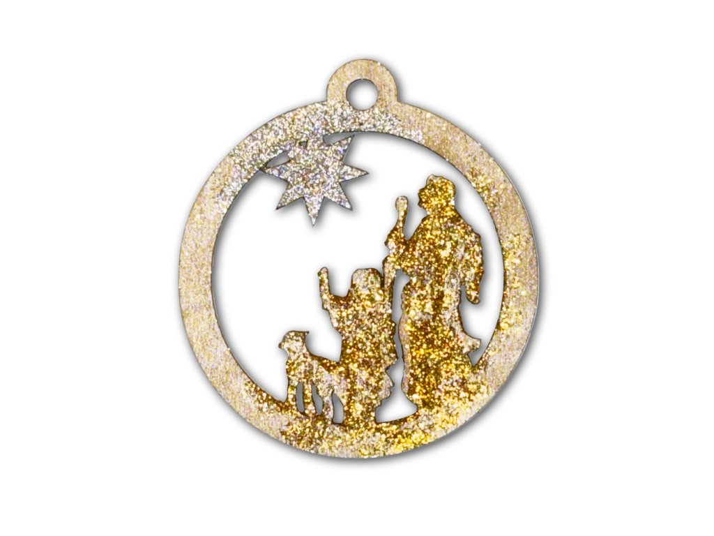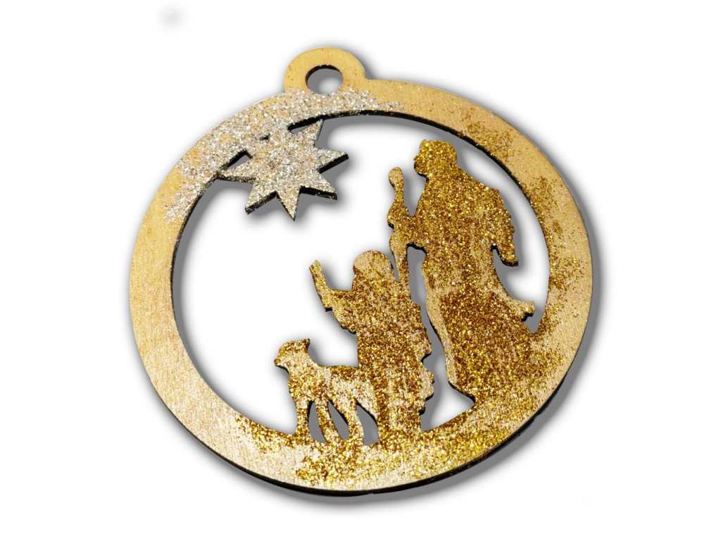 Dřevěná ozdoba na vánoční stromeček s motivem Betlémských pastýřů zdobená perleťovou barvou a třpytkami.