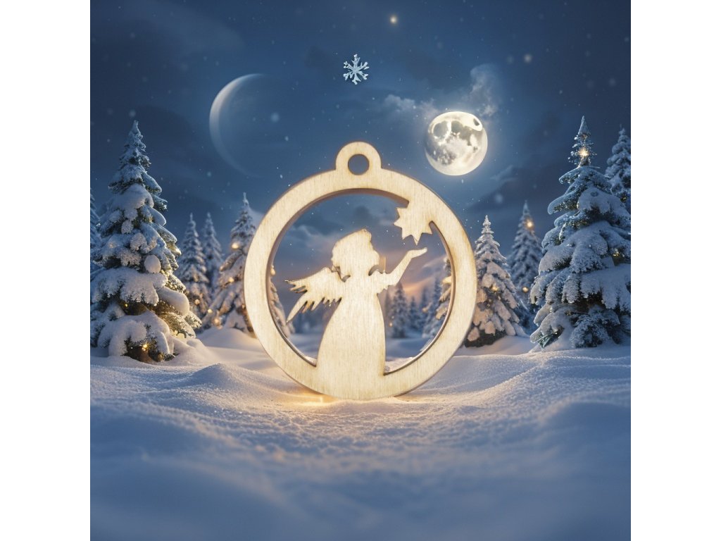 Dřevěná ozdoba na vánoční stromeček s motivem malého andílka dotýkajícího se hvězdy.