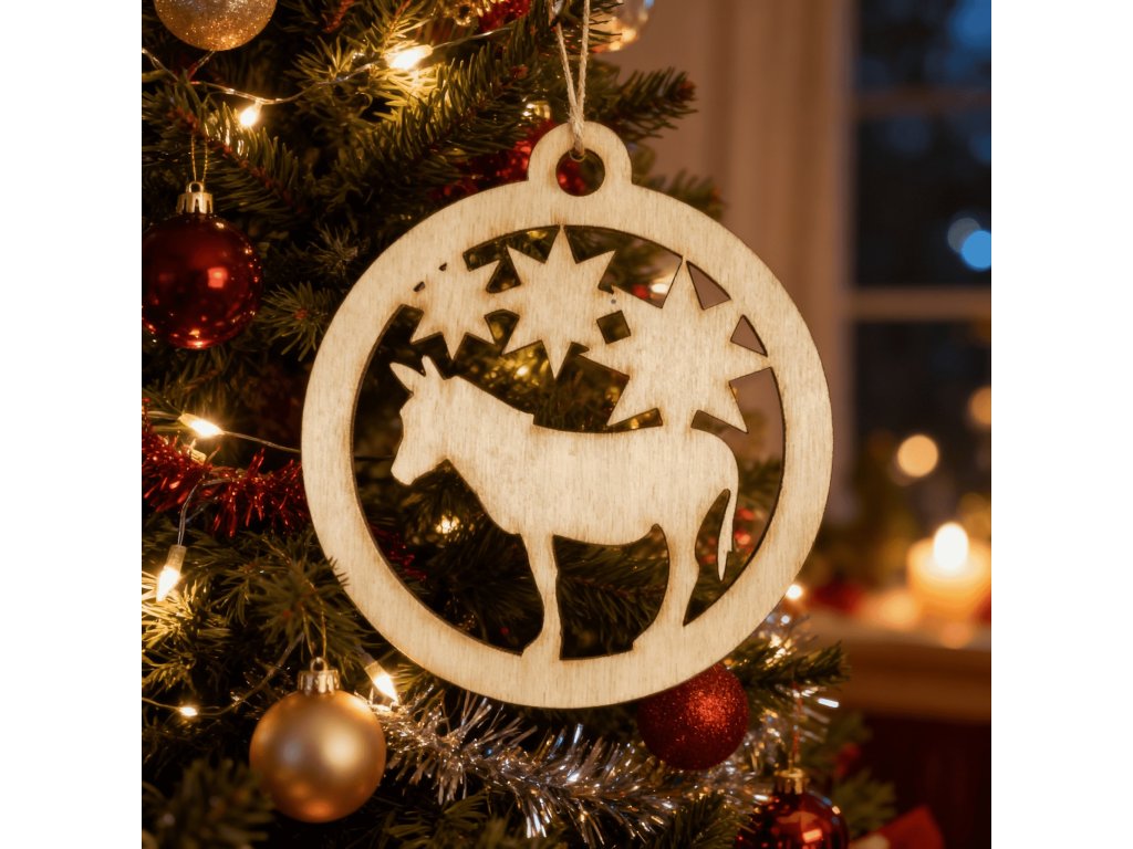Dřevěná ozdoba na vánoční stromeček s motivem oslíka.